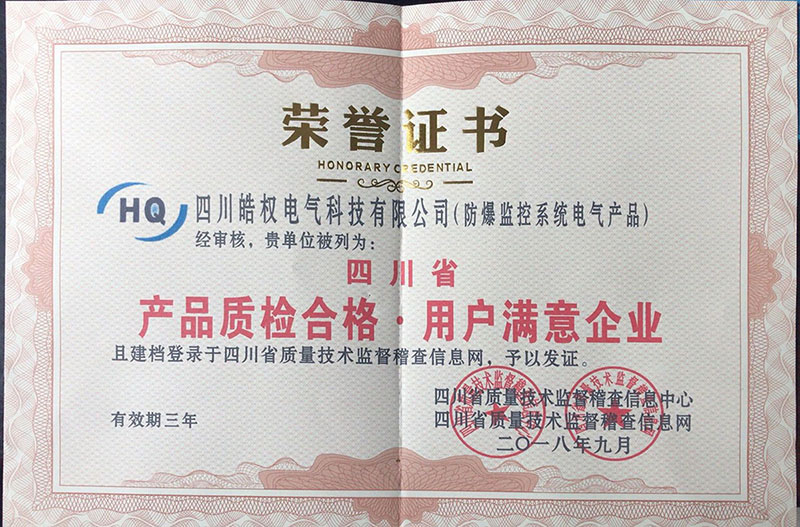 四川皓權電氣科技有限公司榮獲四川省“產品質檢合格·用戶滿意企業(yè)”榮譽單位