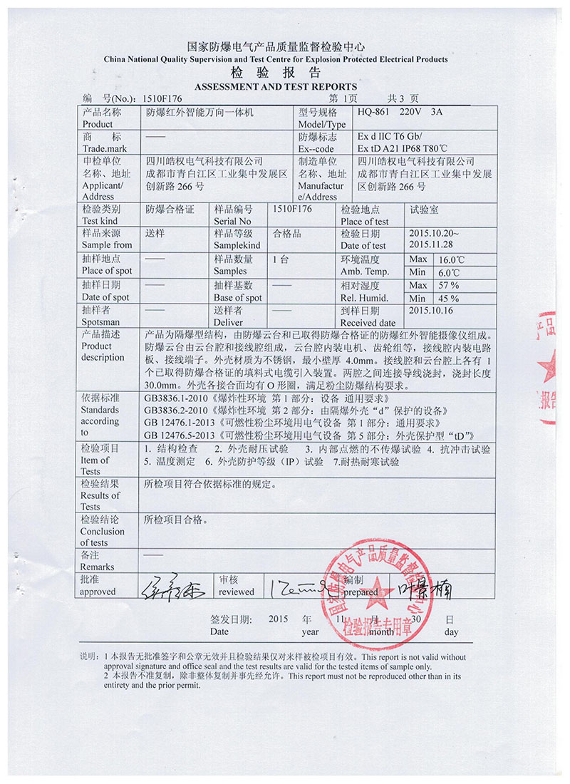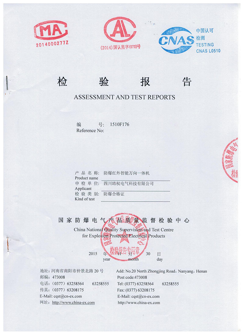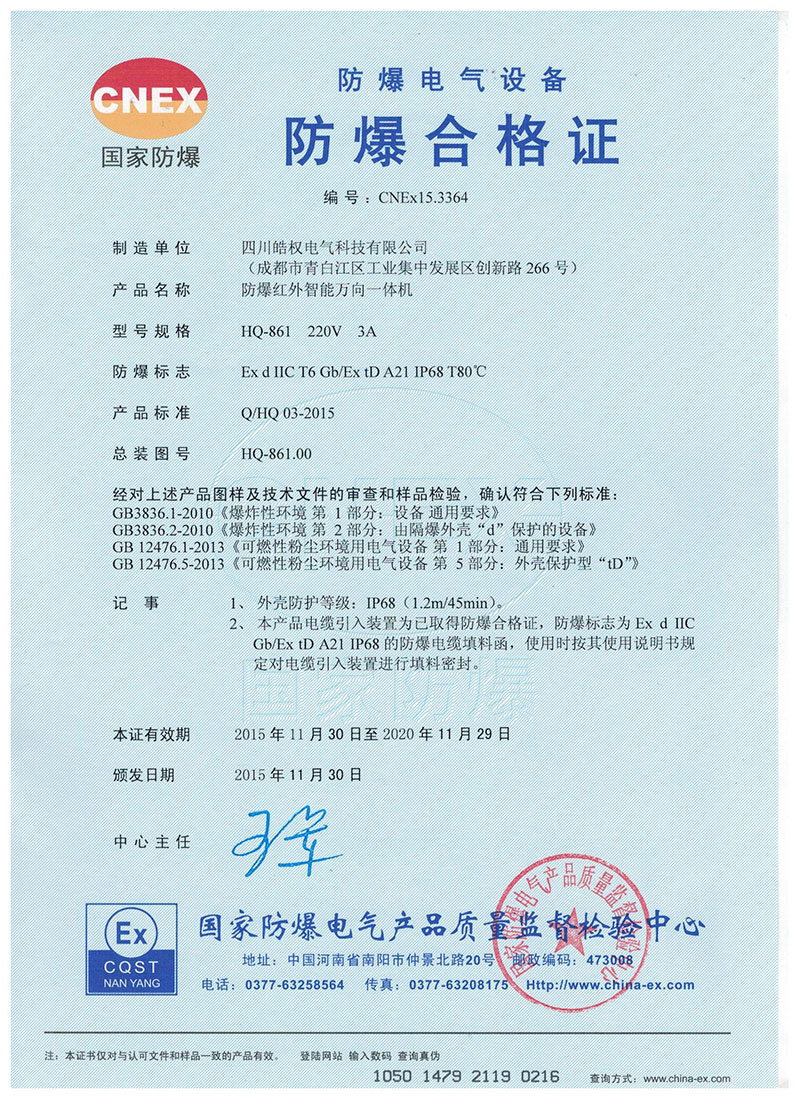 四川皓權電氣科技有限公司的防爆紅外智能萬向一體機榮獲 "國家防爆產品合格證"產品